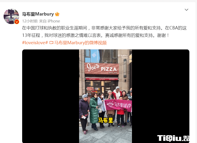 马布里晒出自己与球迷互动的视频,写道:“在中国打球和执教的职业生涯期间,非常感谢大家给予我的所有爱和支持。在CBA的这13年征程,我对球迷的感激之情难以言表。真诚感谢所有的爱和支持。谢谢!”