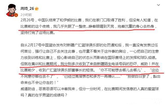 CBA 时间:2023-03-01 15:57来源:编辑:花花看球2月28日深夜,新疆男篮正式宣布退出CBA,而作为当事人之一的周琦也于3月1日发长文对此事做出了回应。在回应的内容中,周琦甚至自爆在备战世预赛集训和比赛期间曾多次接到新疆陌生电话的恐吓和威胁,以至于一度彻夜失眠,带着沉重的身体坚持打完比赛。