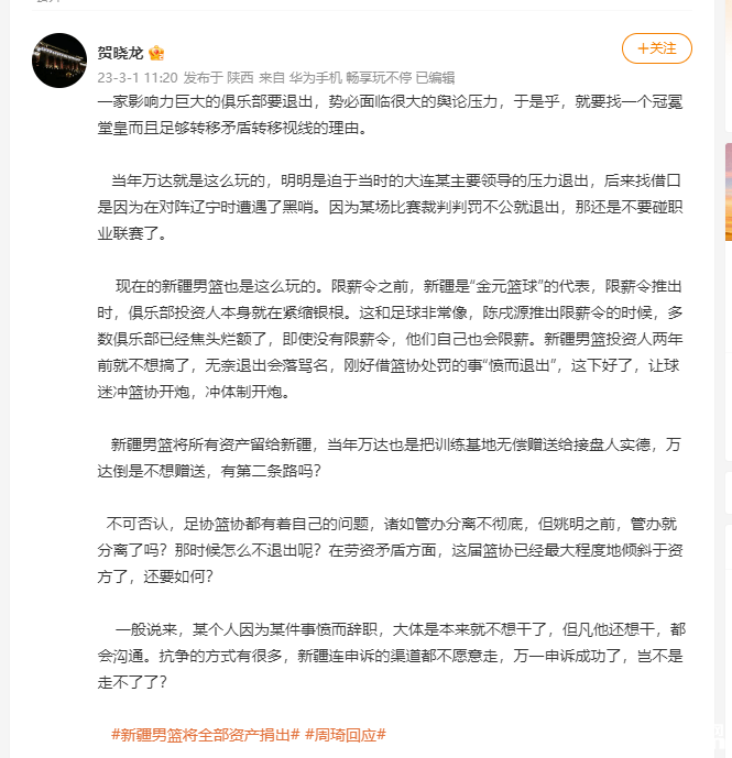 2月28日深夜,因不服篮协处罚,新疆广汇篮球俱乐部发布五千字长文,矛头指向篮协、姚明与周琦,并愤然宣布退出CBA联赛;次日周琦同样发布千字长文,讲述自己与新疆队的恩怨纠葛。