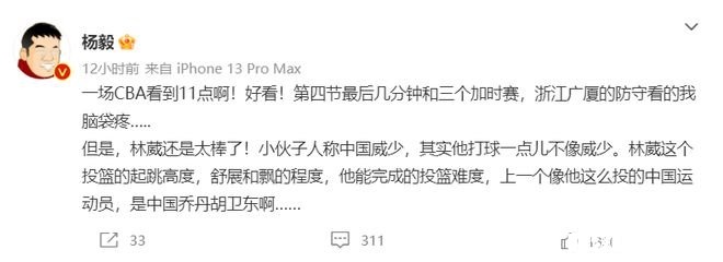 同曦与广厦的比赛一直打到深夜,杨毅表示,这场比赛广厦男篮的防守没有做好,“一场CBA看到11点啊!好看!第四节最后几分钟和三个加时赛,浙江广厦的防守看的我脑袋疼…..”