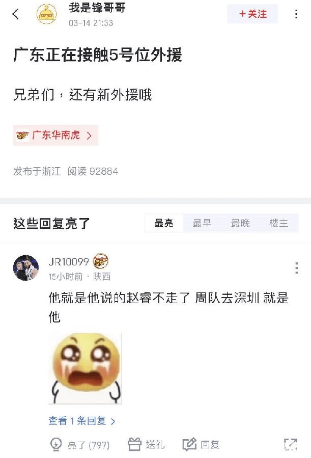 为什么这样说呢?近期,广东媒体人“我是锋哥哥”爆料:广东男篮正在接触5号位外援,兄弟们,还有新援哦。据悉,该媒体人曾经成功的报道了赵睿的留队、周鹏的离队,他的爆料还是有可信性的。