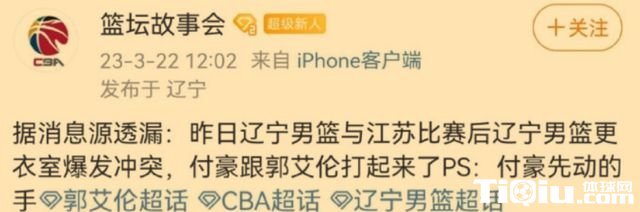CBA 时间:2023-03-23 09:02来源:编辑:神谷玲珑CBA联赛的第三阶段,各大球队风波不断。对于辽宁男篮来说,最近也是不太平。3月22日12时,据篮球媒体人“篮坛故事会”在社交媒体上爆料,辽宁男篮与江苏男篮对决结束后,辽宁球队内部爆发了摩擦,付豪主动动手和郭艾伦打起来了。