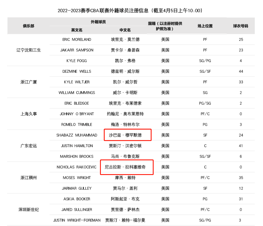 CBA 时间:2023-04-05 16:41来源:编辑:雨后的微笑北京时间4月5日,据最新新闻报导,CBA官网上更新了最新的外籍球员注册表单。浙江队的外援尼古拉斯·拉科塞维奇,和广东队的外援沙巴兹·默罕默德,两名外援在中国CBA官网注册成功。现年31岁的默罕默德,拥有1.98米身高,司职前锋位置,这也是广东队成功签下的第3名外援,用以增强球队的阵容和实力。