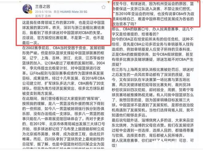 或许是因为两队都可以改变历史,所以这轮系列赛也是吸引了非常多球迷的关注,而在关注之下,名记兰音的爆料也是引发了很多球迷的热议。兰音都说了点啥呢?在浙江男篮和深圳男篮的比赛过后,兰音就在直播中曝出联盟操纵比赛保送浙江男篮,为什么这样说呢?兰音表示因为杭州亚运会在杭州举行,所以一定会保送一支浙江球队进入决赛,至于为什么是浙江男篮而不是广厦呢?一来浙江男篮是体育局的,广厦是民营的。二来看看浙江广厦输球后,楼明的话语或许也不难明白。