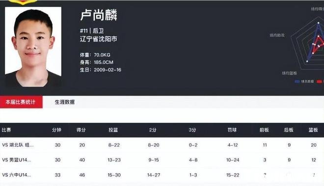卢尚麟是09年的球员,目前身高185公分,体重71公斤,场上司职后卫。卢尚麟是同年龄段球员中的佼佼者,在全国U14的比赛中他表现炸裂,场均轰下35分12篮板2.7抢断。根据骨龄测试,卢尚麟可能的身高是2米左右,这样的高后卫是现代篮球必须的。有意思的是卢尚麟之前成为辽宁球迷热议焦点,当时他被传遭遇广州队挖角,而现在已经确定将加盟辽宁男篮梯队。