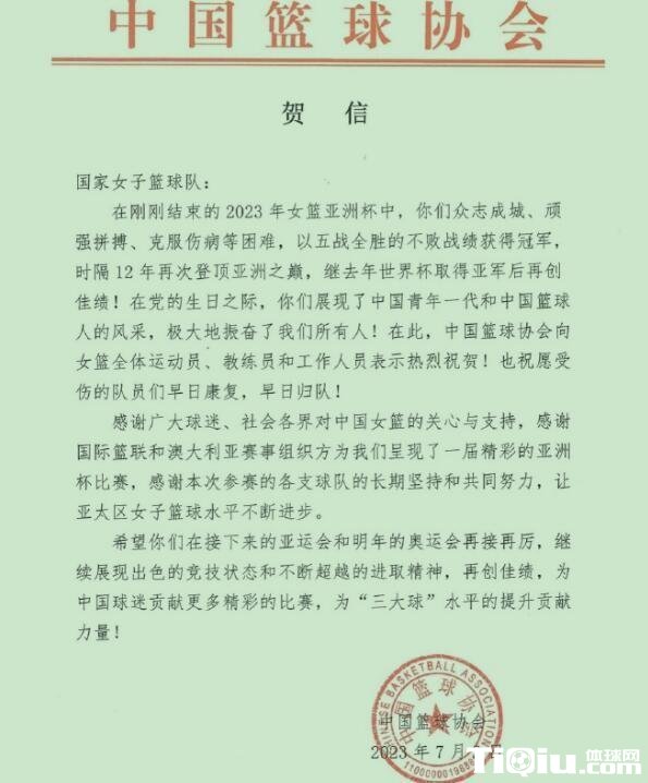 3日,中国篮协也是公布了女篮的奖励,篮协方面并没有给出具体的金钱或者物质奖励,篮协方面给女篮的奖励是一封贺信,篮协恭喜了女篮取得的成绩,并且对于女篮推动三大球提升给出的贡献给予了充分的肯定。