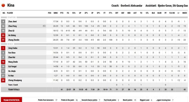 本场比赛周琦复出拿到了13分10个篮板,张镇麟8投7中砍下了20分,二人成为了中国男篮最大的亮点和期待,然而中国男篮后卫线球员一塌糊涂,5位登场的后卫合计15投0中,而且全部5人都是0分,比首场热身赛还惨。