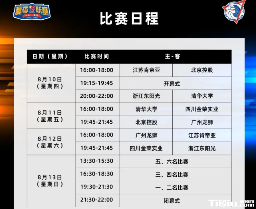 本次夏季联赛赛程设置了4天共9场比赛,6支球队按照抽签分组的形式进行小组赛、排位赛和总决赛。