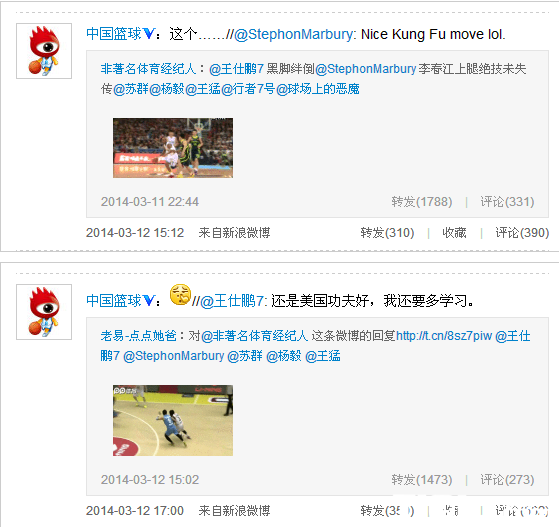 CBA 时间:2014-03-12 10:50来源:未知编辑:不锈钢【导读】北京时间3月12日,北京队和广东队的比赛已经结束一天了,有一位球迷在微博里面放了一张动图,显示上一场比赛王仕鹏在防守马布里的时候下黑脚,随后马布里转发此条微博,并且评论“Nice Kung Fu move lol.”讽刺王仕鹏球品不正,随后王仕鹏也转发了一条关于马布里的微博,并且评论“还是美国功夫好,我还要多学习。”这条微博引起广泛讨论,两位球员之间似乎也剑拔弩张。