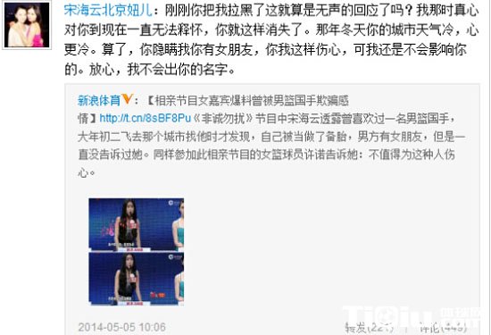 CBA 时间:2014-05-12 13:57来源:http://www.tiqiu.com编辑:Bale【导读】近日,《非诚勿扰》女嘉宾宋海云在节目中爆出被男篮国手“劈腿”欺骗感情后,事情有了后续发展,她在微博里称,已经被该国手拉黑。