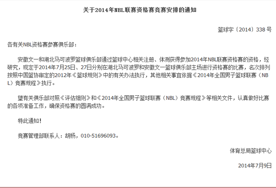 安徽文一和湖北马可波罗篮球俱乐部通过篮球中心相关注册、体测获得参加2014年NBL联赛资格赛的资格,经研究,现定于2014年7月25日、27日分别在湖北马可波罗和安徽文一篮球俱乐部主场进行资格赛的比赛,名次排列按照中国篮协审定的2012年《篮球规则》中的有关办法执行,其他相关事宜依据《2014年全国男子篮球联赛(NBL)竞赛规程》执行。