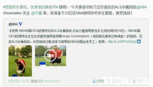 “#受姚校长委托,发表他的接战书# 姚明:“今天接连收到几位好朋友的ALS冰桶挑战@NBA Shoemaker 先生 @于嘉 等,我准备于23日在NBA姚明学校学生面前,接受挑战! ”NBA姚明学校在官方微博宣布了这个消息。
