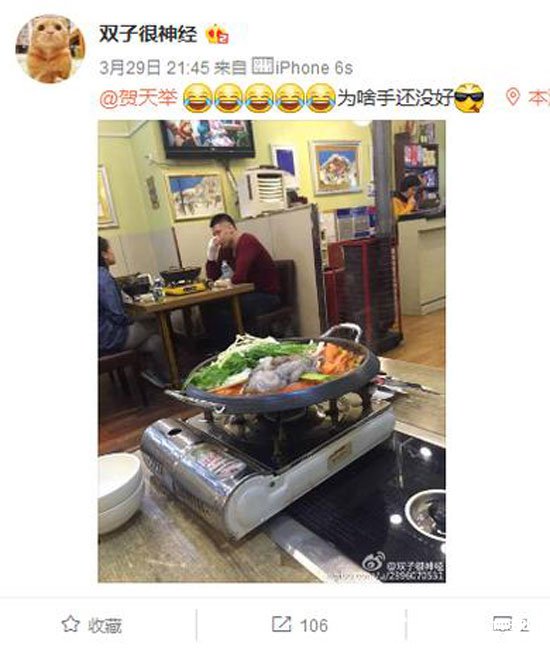 网友曝贺天举近期生活照 右手依旧缠厚绷带