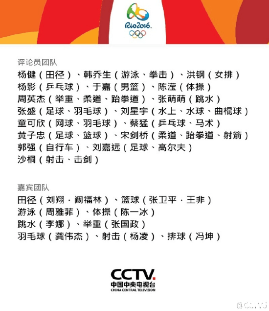 CBA 时间:2016-04-28 15:01来源:网易体育编辑:MR.朱今天距离里约奥运会开幕还有整整100天,值此倒计时纪念活动的日子,将全程直播本次盛会的CCTV5体育频道,正式公布了奥运会的解说团队,其评论员团队将由17名来自央视的资源解说员出任,此外还邀请了11名中国体坛的原优秀运动员担任解说嘉宾,其中包括了不少前奥运会冠军。在备受篮球迷关注的篮球解说项目中,著名评论员于嘉成为了男篮解说的主力;曾以解说“全能”著称的黄子忠,此次将兼任足球与篮球两项解说。而在篮球解说嘉宾的名单中,球迷们熟悉的前国手张卫平与王非联袂入围。而平时也经常出现在篮球评论席的刘星宇,此次被分配到了水上、水球、曲棍球这三个项目的解说。里约奥运会篮球比赛将于8月6日-22日举行。中国男篮已经取得了奥运会参赛资格,他们与美国、澳大利亚、委内瑞拉以及两支落选赛球队同分在A组。中国女篮去年没有获得亚锦赛冠军,因此她们还需要参加今年6月举行的女篮奥运落选赛,力争突围晋级里约奥运会正赛的赛场。