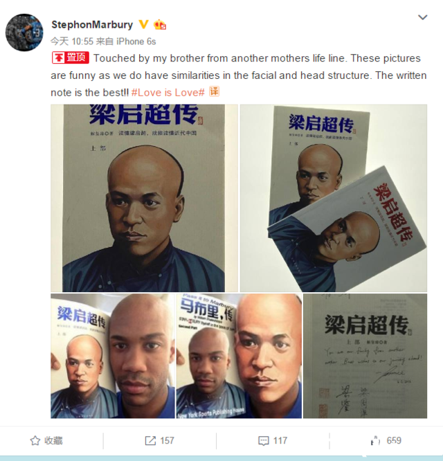 在最后一张照片中,马布里还晒出了梁启超的两名后人梁鉴和梁周洋在书扉页上的签名、拓印和赠言。“我被这位来自不同生命轨迹的兄弟感动了,这些图片很有意思,因为我和他(梁启超)在面部特征上有不少相似的地方。书上的赠言非常棒。”马布里在微博上这样写道。