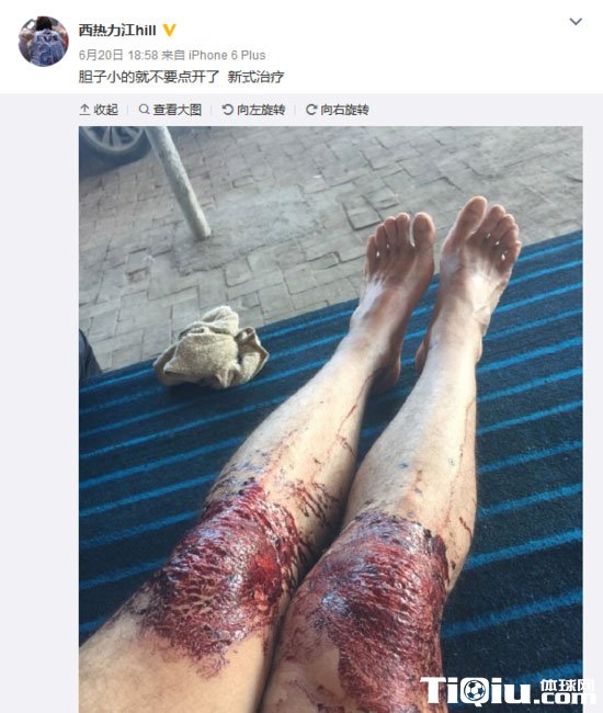 CBA 时间:2016-06-22 13:47来源:腾讯体育编辑:MR.朱近日,西热力江在微博上分享了一张非常“恐怖”的照片。照片中,他的双膝部分大片血渍,看起来十分血腥。据其本人透露,这是他为治疗膝伤采用的一种新式疗法。