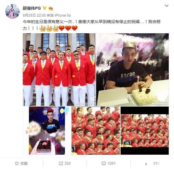 赵继伟晒与队友大会堂合影 称今年生日最有意义