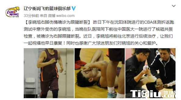 在官方微博中,辽宁队这样写道:“昨日下午在沈阳体院进行的CBA体测折返跑测试中意外受伤的李晓旭,当晚在队医陪同下前往中国医大一院进行了核磁共振检查,被确诊为右脚跟腱断裂。近日,李晓旭将前往北京进行后续治疗,让我们一起祝福他早日康复!同时也感谢广大球迷朋友们对晓旭的关心和爱护。”