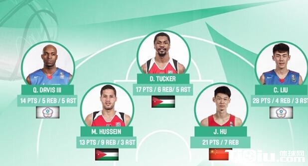 CBA 时间:2016-09-13 13:57来源:腾讯体育编辑:MR.朱入选第四日最佳阵容分别为:胡金秋(21分7个篮板,中国国奥)、刘铮(28分4个篮板3次助攻,中华台北)、昆西-戴维斯(14分5个篮板5次助攻,中华台北)、莫罕默德-侯赛因(13分9个篮板3次助攻,约旦)、拉马尔-塔克(17分6个篮板5次助攻,约旦),以下是官网对五名球员的评价。