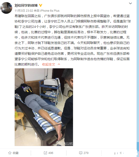 央视记者刘佳在微博上表示:“易建联在回国后,广东俱乐部就将阿联的脚伤报告上报中国篮协,希望通过篮协和李宁公司沟通,让李宁的工作人员上门根据阿联伤势调整鞋子。但是直到“球鞋门”之后的24个小时,李宁公司也并没有联系广东俱乐部。昨天采访阿联的时候,他说,比赛的过程中,脚在鞋里面前后滑动,根本不敢发力,比赛的过程中,他多次和技术代表进行沟通,但技术代表均不予理睬,示意其继续比赛。无奈之下,阿联才脱下球鞋发泄自己的不满。今天和阿联聊天,他也意识到自己的行为太过冲动,并已经诚恳道歉。但是,球鞋对运动员非常重要,业余球迷尚知道要买好鞋保护自己避免运动伤害,更何况专业运动员。现在广东宏远俱乐部希望李宁公司能够尽快和他们取得联系,为阿联制作适合他伤情的球鞋,保证后面比赛的顺利进行。”
