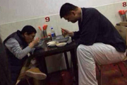网友偶遇姚明吃面 饭馆椅子成板凳